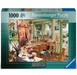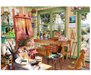 Escape to a creative sanctuary with this premium Ravensburger 1000 piece puzzle for adults featuring Steve Read's charming "Artist's Shed" scene. This high-quality puzzle showcases a peaceful art studio with mountain views and garden scenery, perfect for relaxing yet challenging entertainment.