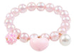 This beautifully crafted bracelet combines classic style with playful charm that makes any outfit feel extra special. The delicate design features round pink beads accented by three stunning charms - a sparkling faceted pink bead, a pearly heart, and a luminous pearl trimmed with gold glitter details. The perfect blend of sophistication and childhood whimsy creates a piece she'll treasure wearing.