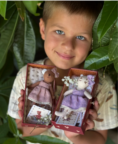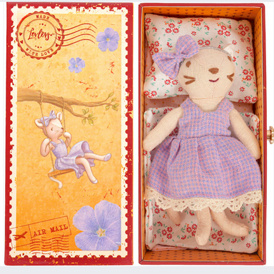 The Levlovs Cat brings storybook charm straight into playtime. Dressed in a lavender linen dress with lace trim and a matching bow, this handcrafte...