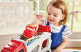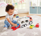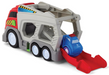 Load ’em up, roll ’em out. This Light ’n Sounds Transporter Truck comes ready with headlights, truck sounds, and two levels for hauling cars. Press the green button for lights and engine noises, then open the back ramp to unload the first level. Pull down the top ramp to send the upper cars rolling. Comes with four colorful free-wheeling vehicles for nonstop loading, driving, and unloading fun.